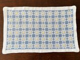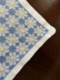 スェーデンの良質の麻地にマーガレットを思わせる花60輪の輪郭をブルーの麻糸のクロスステッチ刺繍で浮き上がらせた清楚なイメージのテーブルセンターです。