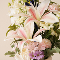 ピンク色のユリを主役に、胡蝶蘭や菊、りんどうなどを組み合わせた