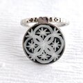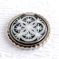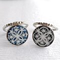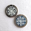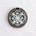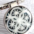 アクリル絵の具で白い模様を描いてレジンを流して硬化させる・・・何度も繰り返して完成させます。円形の部分の深さは1mm程ですが、白い模様が浮き上がったように感じていただけると思います。下描き無しで描いているので、全く同じ物は作れません。