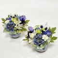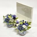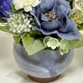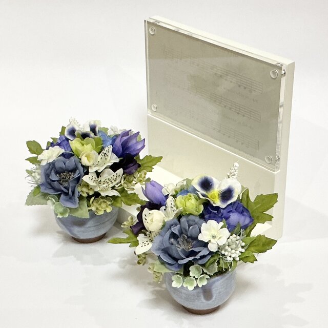 ◇ブルーの濃淡にホワイトの差し色でまとめた、花手毬をイメージした可憐な仏花です