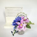 ◇アーティフィシャルフラワーで、ライトグレーの陶器の花器にアレンジしました、ミニサイズの仏花です