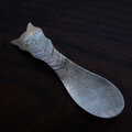 金鎚で全体に荒し模様を付け、猫の顔は鏨という道具を使い、立体感を打ち出し、丁寧に彫って仕上げています。