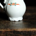 真っ白な色味のボディに赤・緑・黄色の赤絵でのキュートな草花の絵付け。