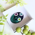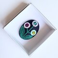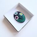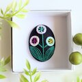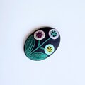 サーモンピンクの地に黒い花の刺繍、ありそうでなかったこの色のとりあわせ、すてきなブローチでした。