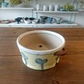 轆轤で成形して黄色の化粧土で彩色した焼き締めの植木鉢です。