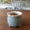 轆轤と手びねりで制作した3本脚の植木鉢です。首元は白、胴体はライトグリーンの化粧土で彩色して針で線を引いてます。