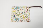 レインボーカラーの動物たちがモチーフのコットン生地で巾着を作りました。片ひも仕様で、ストッパー付き。