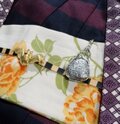 写真4 帯飾りとしての使い方は、プレート部分を帯内側(おなか部分)に挟み、プレートと反対の紐の先端にペンダントトップまたは木彫り・ガラスなどの根付を取り付けてたらして飾ります。