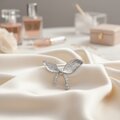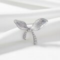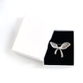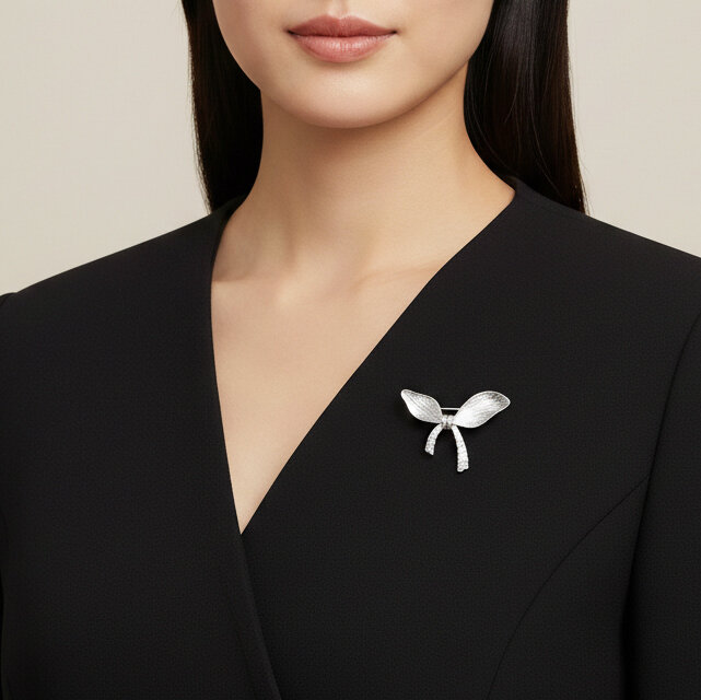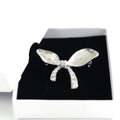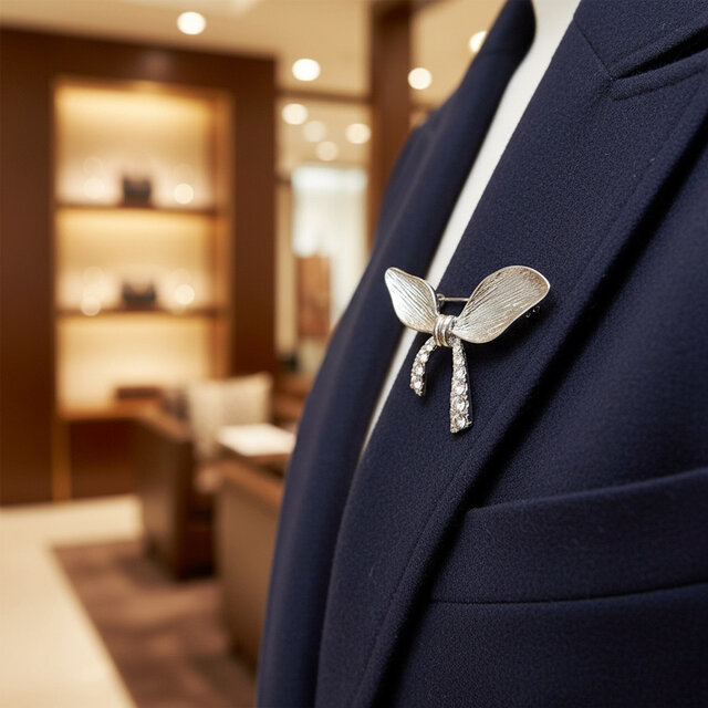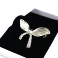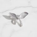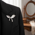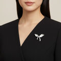 繊細な羽根のようなリボンデザインが印象的な、光沢シルバー仕上げの真鍮製ブローチ。中央の結び目から流れるラインには、きらめくストーンを贅沢にあしらい、上品な華やかさを演出します。低金属アレルギー仕様で、敏感肌の方にもおすすめ。ストールやジャケットのアクセントとして、季節問わずお使いいただけます。贈り物にも最適なアイテムです。