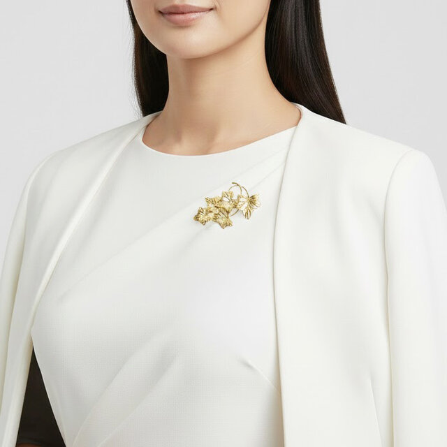 つたうように連なるアイビーの葉を立体的に表現した、真鍮製のブローチ。一枚一枚異なる大きさと角度で重なり合うデザインが、自然の美しさと動きを感じさせてくれます。艶を抑えたアンティーク調ゴールドが上品で落ち着いた印象を演出。ジャケットやワンピース、ストールなど、装いのアクセントに取り入れるだけで洗練された雰囲気に。専用ボックス入りで、季節のギフトや特別な贈り物にもおすすめです。