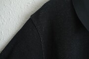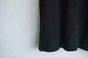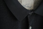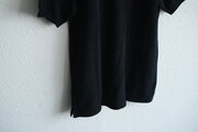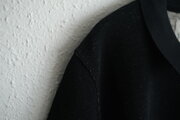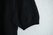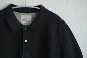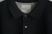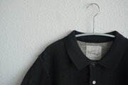 1重のニットで、生地はダブルフェイス。表が黒、裏が生成り色です。表地にも伸縮や角度によって裏の生成色が少し見え、上品な奥行きのある生地。生地の厚みは薄くはないですが、編み地自体がさらっとした肌触りで肌離れよくさらっとしていることと、素材にリネンが入ることで通気性と清涼感があり、色もリネンならではの艶感が特長です。一般的なコットンポロシャツよりも綺麗で上品な印象があります。