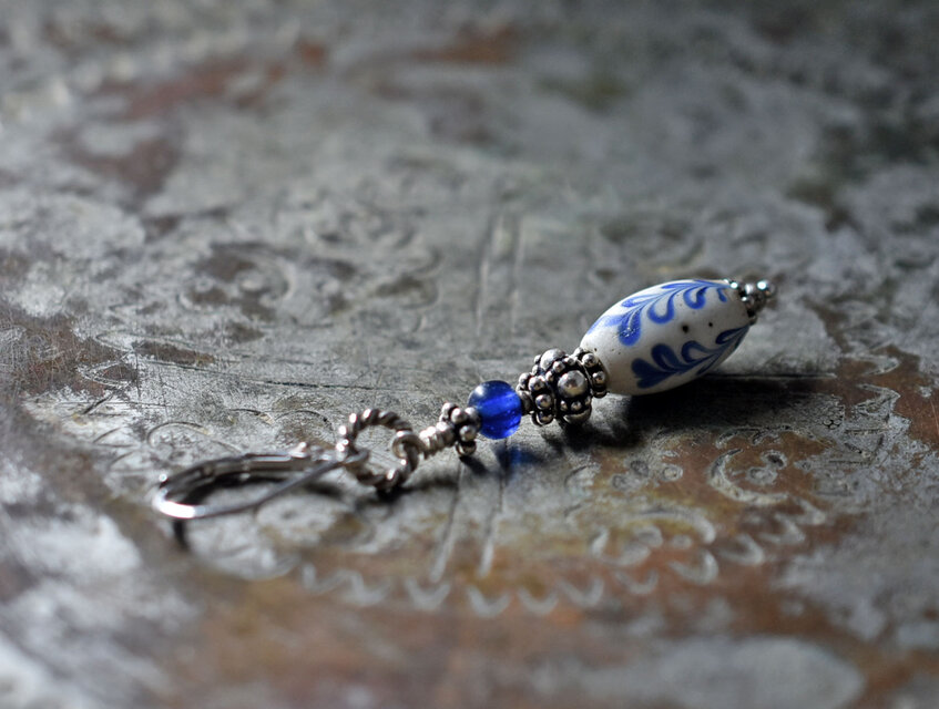 アンティークヴェネチアダッチデルフトとシルバービーズ、ブルーアンティークビーズを繋いだ片耳ピアスです。