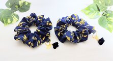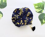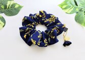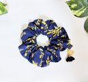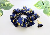 ネイビーの綿リネン生地に可愛いミモザの花柄、少しボリュームがあり大人可愛いシュシュです。