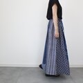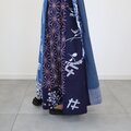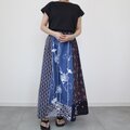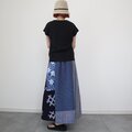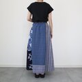 古い浴衣生地をパッチワークして作ったウエストゴムのギャザースカートです。タックも入れているので腰回りはすっきりしています。内側タグを前後どちらかの中心に合わせてご着用ください。前後のないスカートなのでどちらを前にして穿くことができます。裏地はありません。