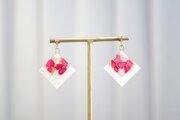 透明のレジンにホワイトシェルとローズピンクに着色されたシェルを沈め、光沢のあるホワイトで囲ったピアス。