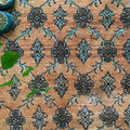 グラデーション感じるペールオレンジをベースに、チョコレートカラーの紋章柄のお部屋に馴染む色合いです