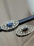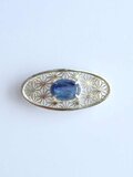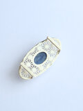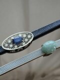 麻の葉文様の透かし細工に、深く澄んだ青のカイヤナイトをあしらった帯留。