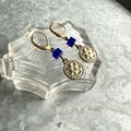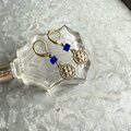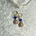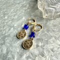 ブルービーズがアクセントのゴールドトーンピアス。ハンマーで叩いたようなテクスチャーのパーツビーズがぶら下がり、民族的なエッセンスがあり魅力的です。