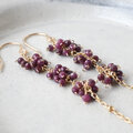 たわわに実ったぶどう実のようなルビーのつぶ感がナチュラルな存在感を放つロングピアスです。赤紫のシックな色合いとゴールドのリュクスな輝きが秋の空気を運んでくれます。カットの入ったルビーなので光をきれいに反射します。ちいさな石たちがゆらりと揺れる姿がとても素敵。チェーンの先端には14kgfビーズとルビーの粒がアクセントについています。