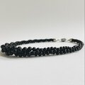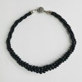 こちらはガラス素材の原玉に、オリジナルカラーのブラック塗料にて何層にも渡り重ね塗りを施した日本製のガラス塗装ビーズネックレスになります。約4mm~8mmサイズの玉をグラデーションにした3本を、ツイスト状にねじって留めた3連ネックレスで仕上げました。長さは全長約43cm弱と標準的なプリンセスタイプで、クラスプは差し込み式の簡単なタイプになっております。