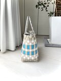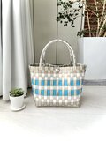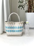 ★ターコイズブルーのような青色をポイントに、グレージュや白・ライン柄をミックスした、涼しげな色合いのプラカゴトートになります。
