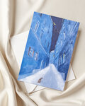 水彩で描いた、三日月の夜の町と子犬のイラストレーションのポストカード