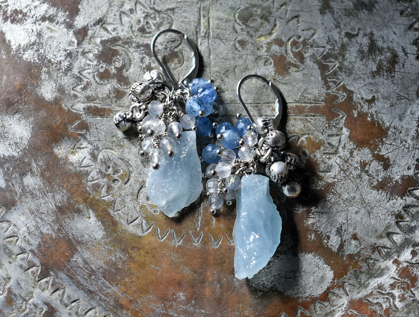 氷柱アクアマリンとたわわなアクアマリン&ラブラドライト&インドシルバー鈴を繋いだピアスです。