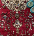 重厚感と高級感のある、臙脂がかった深みある赤を基調に、キャメルカラーベースのコロンと丸いメダリオンと周りに散らばる繊細な幾何学文様が相まって、まるで宝石のように雰囲気ある1枚