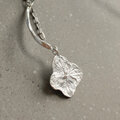 可愛らしいアジサイの花とメタルパーツのコントラストが美しいクリップタイプのイヤリングです。本物のアジサイの花から型取りしたピアストップとハンドメイドのシルバースティックは線全体に緩いカットとねじりが加えられているのでどの角度からでも動きがあり横顔を立体的に引き立ててくれます。イヤリング部分はバネの入っていないタイプを採用しているので長時間着けていても痛くなりにくく、シリコンキャッチがフィット感を上げます。