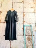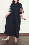 ブラックカットソー&メッシュドットドロップショルダーパフスリーブワンピース
