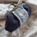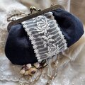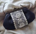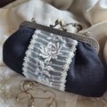 黒リネンにアンティークレースをのせたがま口バッグです。