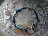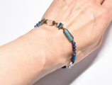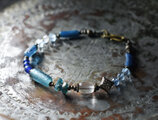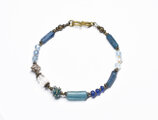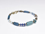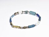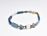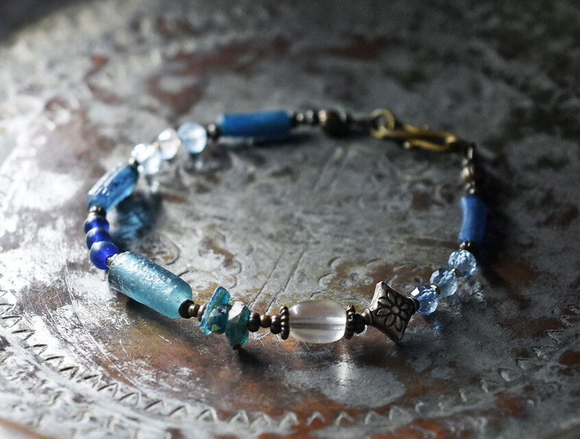 多彩ブルーローマングラスとアンティークボヘミアビーズ、インドシルバー、アクアマリン&ハーキマーダイヤモンドなどを繋いだブレスです。