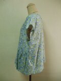 薄いグレー地×ヨット柄プリントのラウンドネックフレンチスリーブ切り替えギャザー入りプルオーバーです♪たっぷりしたデザインです♪