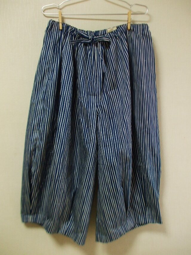 【ラスト1】青色×白色手書き風ストライプ柄 かぼちゃシルエットパンツ M~LLサイズ 綿100%