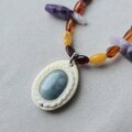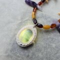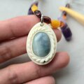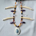 美しいグアテマラ産の本翡翠をトップに、野性味あふれるイノシシの牙、アメジストのタンブルカット、透明度の高いクリスタル氷柱カット、そしてバルティックアンバーを贅沢に繋いだ力強くも繊細なネックレスです。