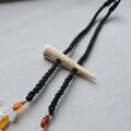 紐の長さ調整ビーズには鹿の角を削り出し、首元には手編みの鹿革四つ組紐を。