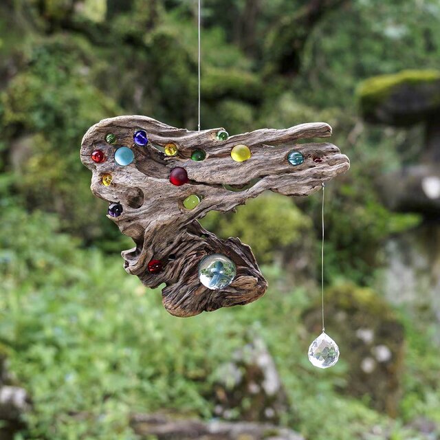 流木とサンキャッチャー、ガラス玉、ビー玉など、様々な素材を組み合わせた流木アート、流木のオブジェです。