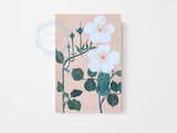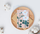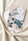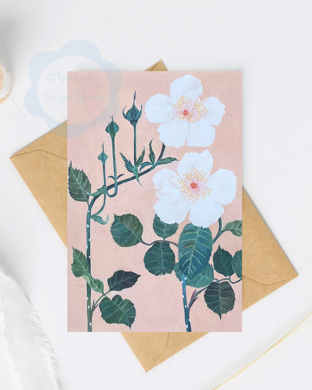 サーモンピンクの背景に、一重の白いバラが二輪咲いている水彩イラストレーションのポストカード「3枚セット」です