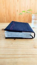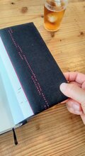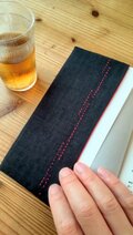 本が入る部分は、本の角が引っ掛からないよう、細かい目の模様にしています。奥まで刺し子をしているので丈夫です。