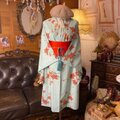ミントアイスブルーに、朱と橙の梅花が水彩のようににじむ。早春の息吹をそのまま纏う着物をワンピースへとリメイク。すっと落ち感のある生地が動くたびに光を拾い、胸下からしなやかに広がるシルエットが体を優しく包み込みます。緋色のコルセットベルトが装いを引き締め、くすみターコイズのタッセルコードがひんやりとしたニュアンスをプラス。足元は白スニーカーで抜け感を、あるいはゴールドサンダルで艶めきを添えて。花見やガーデンパーティー、初夏の街歩きまで、和の気品とモダンな軽やかさを一着で叶える春待ちドレスです。