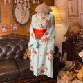 【 着物リメイク ワンピース ドレス 洗える 化繊 帯サッシュベルト 和洋折衷 レトロ 古着 ハンドメイド ミントアイスブルーに、朱と橙の梅花 KW-1026】