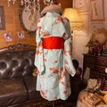 着物リメイク ワンピース ドレス 洗える 化繊 帯サッシュベルト 和洋折衷 ミントアイスブルーに、朱と橙の梅花 KW-1026