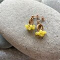 筋模様の入ったヴィンテージリングの落ち着いたブラスカラーに、天然石の柔らかなレモンイエローが映えます。ほんのり透け感ある粒々が、優しく光を反射して可憐に揺れるピアスになりました。