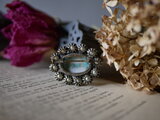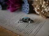 パールのようなビーズが丁寧に包まれ、スカイブルーの石を際立たせています。