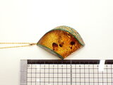 琥珀のオレンジ色と貝の緑が映え、存在感のある作品となっています。