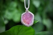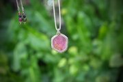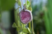 フラットなルビー原石そのままの形を囲み編みにてペンダントに。