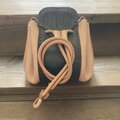 シボ入りのピンクベージュの革と型押しで縞模様が入っているダークブラウンの革の組み合わせをキャメルカラーの糸で仕上げておりナチュラルカラーの革紐で絞るタイプのポーチです。
