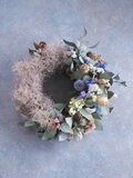 ドライフラワーなのですが、色彩に富んでいて、オレンジ色の木の実や、ブラウンのお花や松ぼっくりが、秋を感じさせてくれます。また、箱を開けた時の、ユーカリの葉のとても良い香りも、嬉しかったです。今回も、素敵なリース、ありがとうございました。
