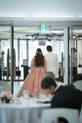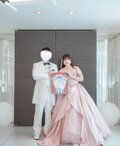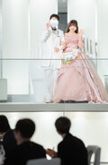 実例写真!カラードレス ピンク オフショルダー ラッフルフリル プリンセスライン 花嫁