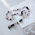 黒い大粒のパーツはアクリル製。マルチカラーのフローライトはパープル系でそろえました。